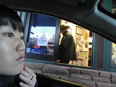 キングマンで昼食を摂る予定が、もう1時すぎ。時間節約のため、スーパーでサンドイッチとコ−ヒーを買い、運転しながら食べることにした。そうしないとグランドキャニオンの夕日に間に合わない可能性が出てきた。