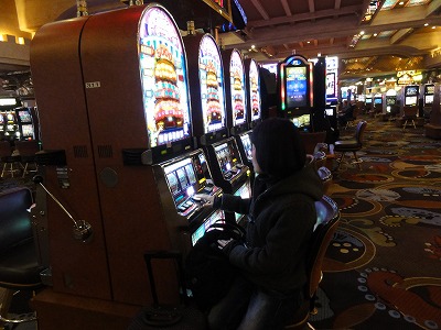 昨夜のカジノがいつまでやっているのか気になっていた。ロビーに降りると、なんと人数こそ減っていたが昨夜と同じ風景。24時間やっているのだ。
