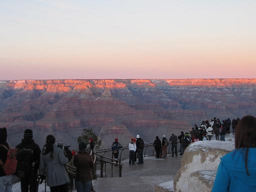 そして雪の中を歩いてグランドキャニオンの方向へ。始めて見るグランドキャニオンは・・・すごい!としか言葉がでない。下は断崖になり、はるか下をコロラド川が流れている。向こう岸は延々と地層の階段が広がる。