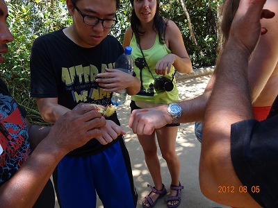 <原住民が顔に塗る木の実を手に塗る:中央が韓国の学生>