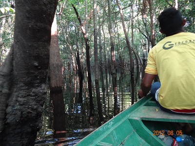 午後はカヌートリップと名づけられている本格的な動物探し。船は二艘で5人ずつを乗せ、島の裏側の岸辺近くや沈下林の中をゆっくり動物を探しながら走る。