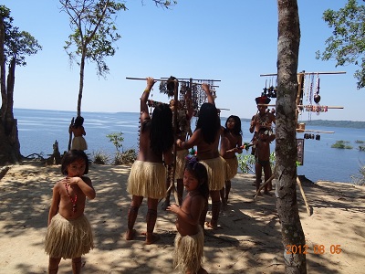 船は30分ほどかけてネグロ川を横切る。原住民の部落は川を横切った岸辺の高台にあった。村に着くとさっそく大きな小屋に通され、踊りが始まる。原住民は昔ながらの半裸の姿で生活していて目のやり場に困った?