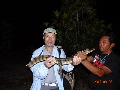 夕方になり、今度はワニを探すらしい。宿泊地近くの陸地に上陸する。ガイドが先頭で薄暗い岸辺を樹林の中に分け入る。足が水につかり靴が濡れる。ちゅうちょしていると、ガイドはさらにどんどん進みあっという間にワニの子を捕まえもどってくる。