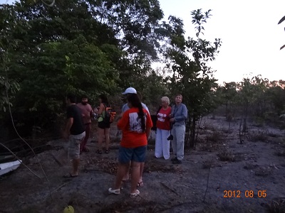 小さなワニを、みんなでめずらしそうに触っていると、もう一人のガイドが大きな1mくらいのワニを捕まえもどってきた。みんなびっくり。おそるおそる見て、順番に持たせてもらい写真を撮る。あたりはもうすっかり真っ暗。