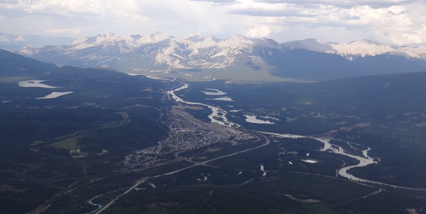 北にはジャスパーの町やその向こうの白い山群。