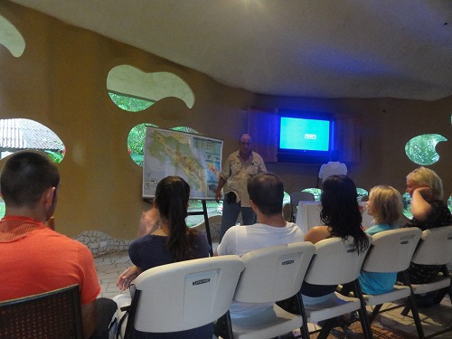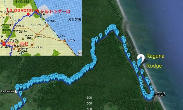 ![]() <ウミガメの産卵跡> このあたりの写真地図(google)です。 トルトゥゲーロとは、「ウミガメのいる場所」という意味。名前の通りここへは、たくさんのウミガメが産卵のためにやってくる。 世界に生息するウミガメは7〜8種類で、コスタリカの海岸にはそのうち6種類が産卵にやってくるという。トルトゥゲーロの海岸では、大量のアオウミガメが捕獲され、絶滅の危機にさらされた。そのため、コスタリカ政府はトルトゥゲーロでのウミガメの捕獲を禁じ、35kmに及ぶ海岸と近隣地帯を国立公園に指定した。 夜のウミガメ観察ツアーに参加する。残念ながらカメの観察中は撮影禁止だったが、赤いライトに照らされたカメは産卵を終え、大海原に帰っていった姿は私の脳裏に深く刻み込めた。