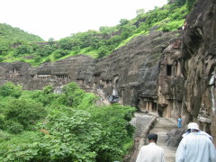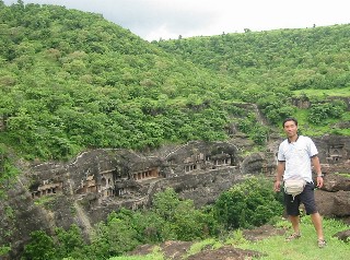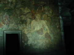 ここは紀元前1世紀から紀元後5世紀までの間に作られた約30の仏教の石窟があり,1819年にトラを狩りしていたイギリス兵により発見されるまで眠っていたのだ。それぞれの石窟の中には壁画や仏像が削ったままの石から掘られている。教科書で見たような菩薩の壁画も色が残っており、すばらしい。現地ガイドは主な洞窟しか案内しないが,自由時間になり,Kは奥の30番からすべての洞窟を順に見ながら下っている。あいかわらずのこのエネルギーはすごい!と感心しながらつきあう。