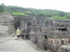 そして16窟のカイラサナータ寺院へ。ここが今回の旅行の後半のハイライトである。約100年以上かけ,岩の斜面を切り開き,高さ33m、奥行き81m,幅44mの大寺院をくりぬき、その中にはさまざまな彫刻や装飾をほどこしている。中から横から上からとどこから見ても見ごたえがあり,さすがに圧倒される。