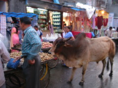 夕食前にリキシャーで町の中心のマーケットに出て見る。たくさんの人手。お菓子屋により甘い物を食べる。インドの人達は辛い物ばかりでなく、甘い物も大好物だ。牛が歩いていて、スキをついて屋台の野菜や果物を食べ、店の人も困っていたのが面白かった。 <野菜を食べ歩く牛>
