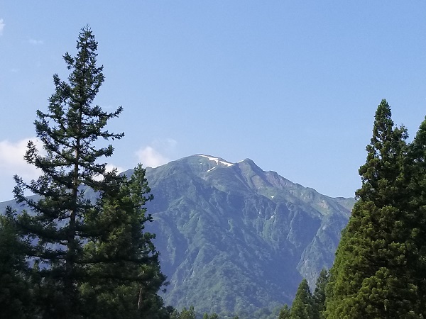 <枝折峠手前の車道から見えた残雪が残っている越後駒駒ケ岳>