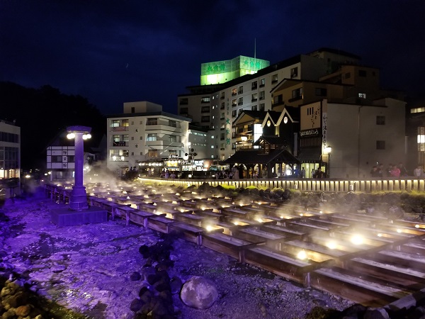 温泉街の上の方に無料駐車場を見つけ車を止める。すでに多くの車が止まっていてみんな車中泊をするらしい。本格的なキャンピングカーもある。車を止めてタオルを持って下の温泉街に出かける。日帰り温泉があり入る。食事は時間が過ぎていて取れなかったので温泉街の適当な店に入る。