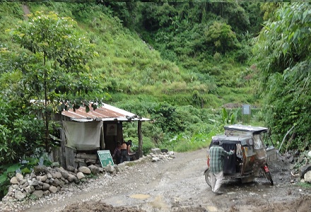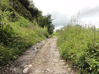 おじさんは先に立ちライステラスへ下っていく。後を追う。ライステラスを横切る。途中、一部が土砂崩れで埋まっている。それを通り過ぎ、下方に下る。やがて崖のそばの売店に着く。あとはここを下っていくと滝があるといってガイドは分かれる。売店のおばさんにコーラを買って荷物を預かってもらう。
