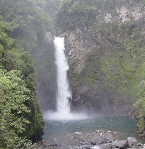急な階段を100mほど下り、さらに水平に500mほど行った奥まった所に滝があった。欧米の観光客が水浴びしている。あいにく雨が降ってきたがすぐにやむ。